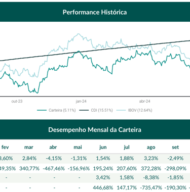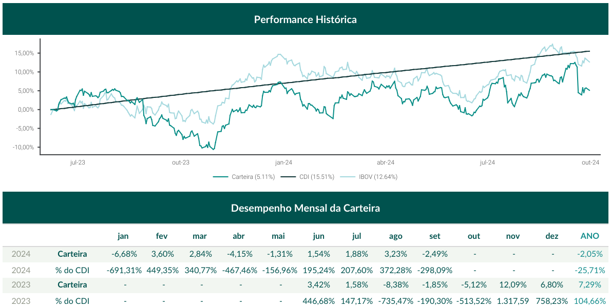 Desde o início: MLUCA +5,11% | IBOV +12,64% | CDI +15,51%